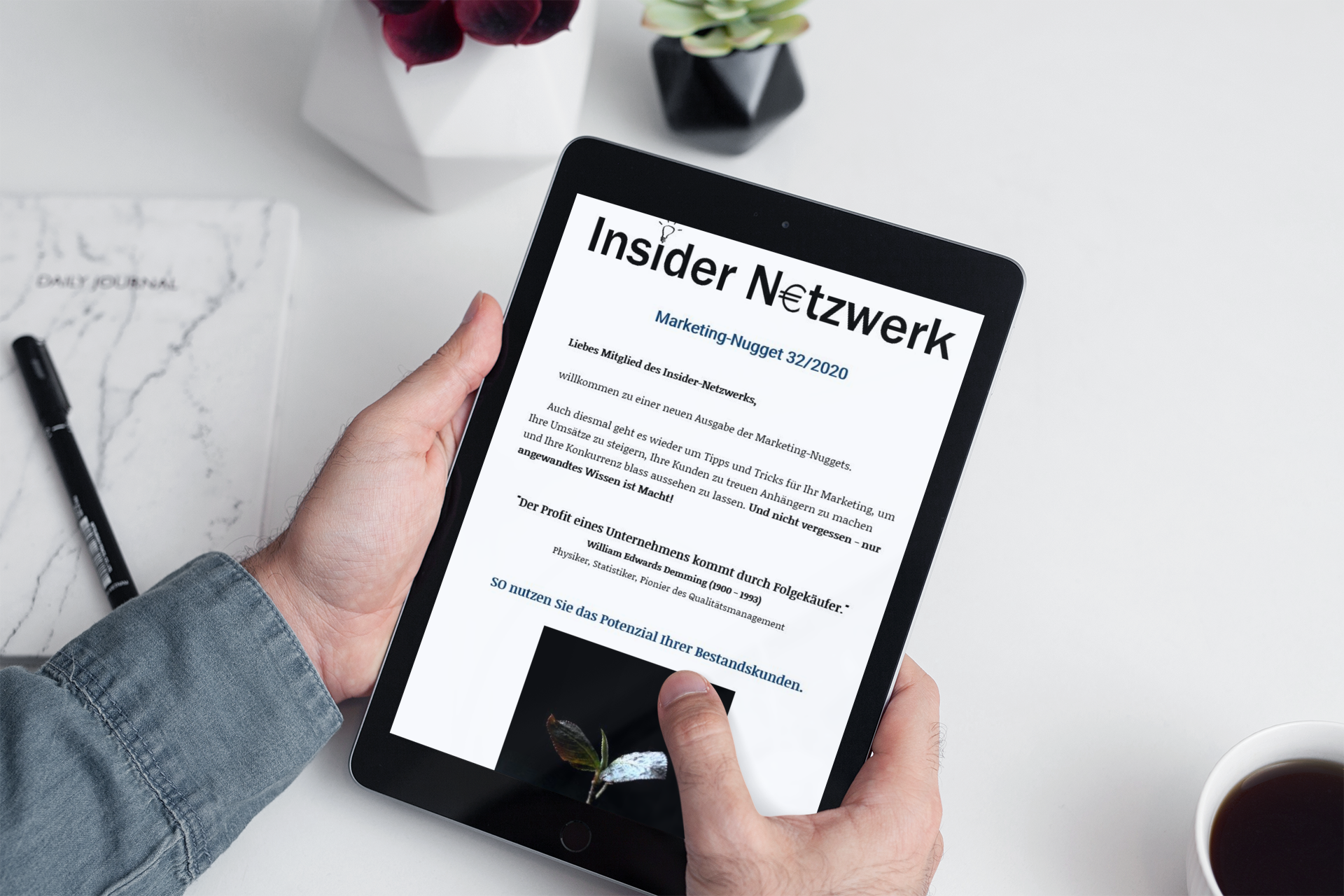 dem Insider Netzwerk. Damit erhalten Sie wöchtlich meinen E-Newsletter "Marketing Nuggets" mit Tipps und Tricks für Ihr Business, Ihr Marketing, Ihre Werbung. 100 % purer Content - No Spam! Und Sie können sich jederzeit mit dem Link am Ende des Newsletters wieder abmelden.